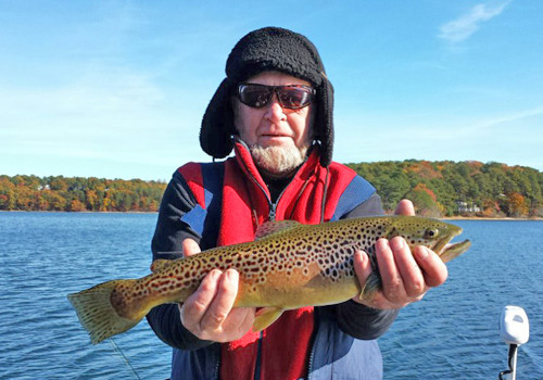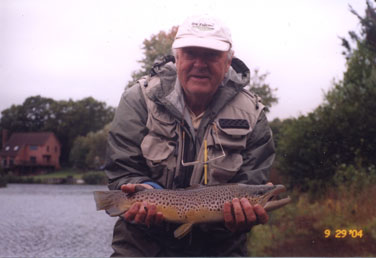 Al Grover caught this 5-6 pound browntrout, on a size 8 Blassingame and a 6x tippet. Picture by Dick Empie Dick Empie caught this tiger trout in Whitings Pond, Sept. 2004. The net is 23 inches long. . . . . .. . ... Picture by Dick Empie. Club Trip to Monomoy, August 22nd, 2004