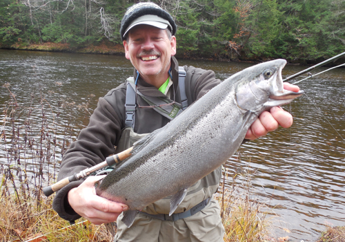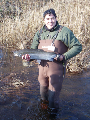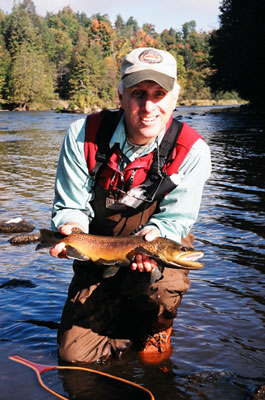 Armand Courchaine. Howie Debeck, Dave Ferretti, Dick Bowman, John Kenney (not in the picture)gearing Up Photo taken by Joel Kessler, who organized the trip. Howie Got One Joel Kessler and a 23 Inch Wild Brown Trout on the Chateaugay River, Malone NY Register for Members Only Message BoardThe Message Board has been upgraded to hold more messages and photos. Instuctions for uploading messages. Sign up for our message board to find out or tell others about good fishing spots, what flies to use, how to tie a fly, or anything else of interest. The message board is easy to use. Click here to see how. If you are having any problems with the message board or with this website, please email them to the webmaster. |