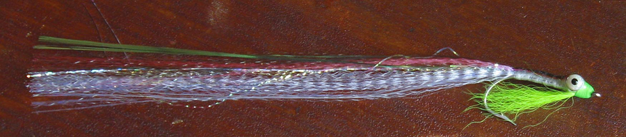 EYES: #3 or #4 Stu Dickens Krystal Eyes (Pearl) or Real Eyes 5132 with silver prism eye inserts HOOK: #34007 Mustard or # 254 Eagle Claw Size #1 - 1/0 THREAD: Danville "A" White (Body) and Danville "A" Chartreuse (Head) TAIL/BODY: Nylon Synthetic Material (Supreme Hair, Ultra Hair, or Super Hair) Colors: White, Polar Bear, Pink, Lt. Blue, and Olive Tail/Wing tying sequence from the bottom up (using white thread). Start trimming ends of nylon in front of Krystal Eyes. 2-3 turns of thread, run over top of the eyes, sparsely wrap body to bend of hook 4-5 wraps. Then wrap forward to and under eyes 5-6 wraps ending between Krystal Eyes and hook eye. Repeat for each layer of the wing/tail. Stacking them neatly one on top of the other. Applying slight up pressure when holding wing material, followed by sparse wraps of thread, keeps all layers neatly on top of each other in layers. Tied from the bottom up, in sparse amounts, 6"- 10" long.